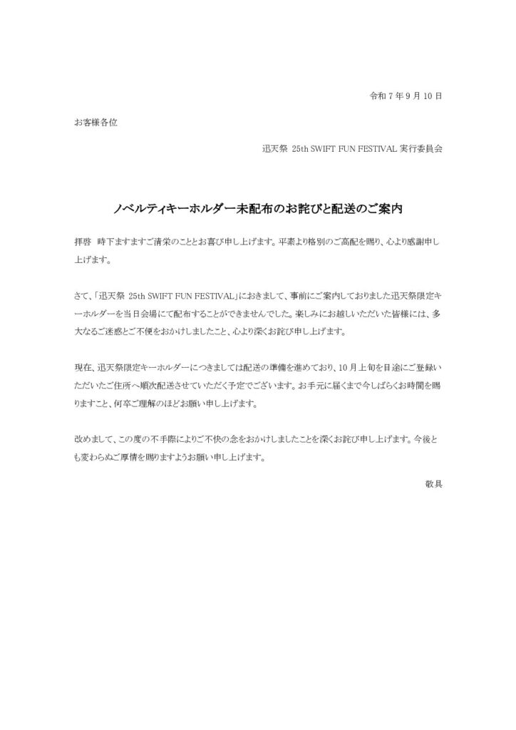 さて、「迅天祭 25th SWIFT FUN FESTIVAL」におきまして、事前にご案内しておりました迅天祭限定キーホルダーを当日会場にて配布することができませんでした。楽しみにお越しいただいた皆様には、多大なるご迷惑とご不便をおかけしましたこと、心より深くお詫び申し上げます。